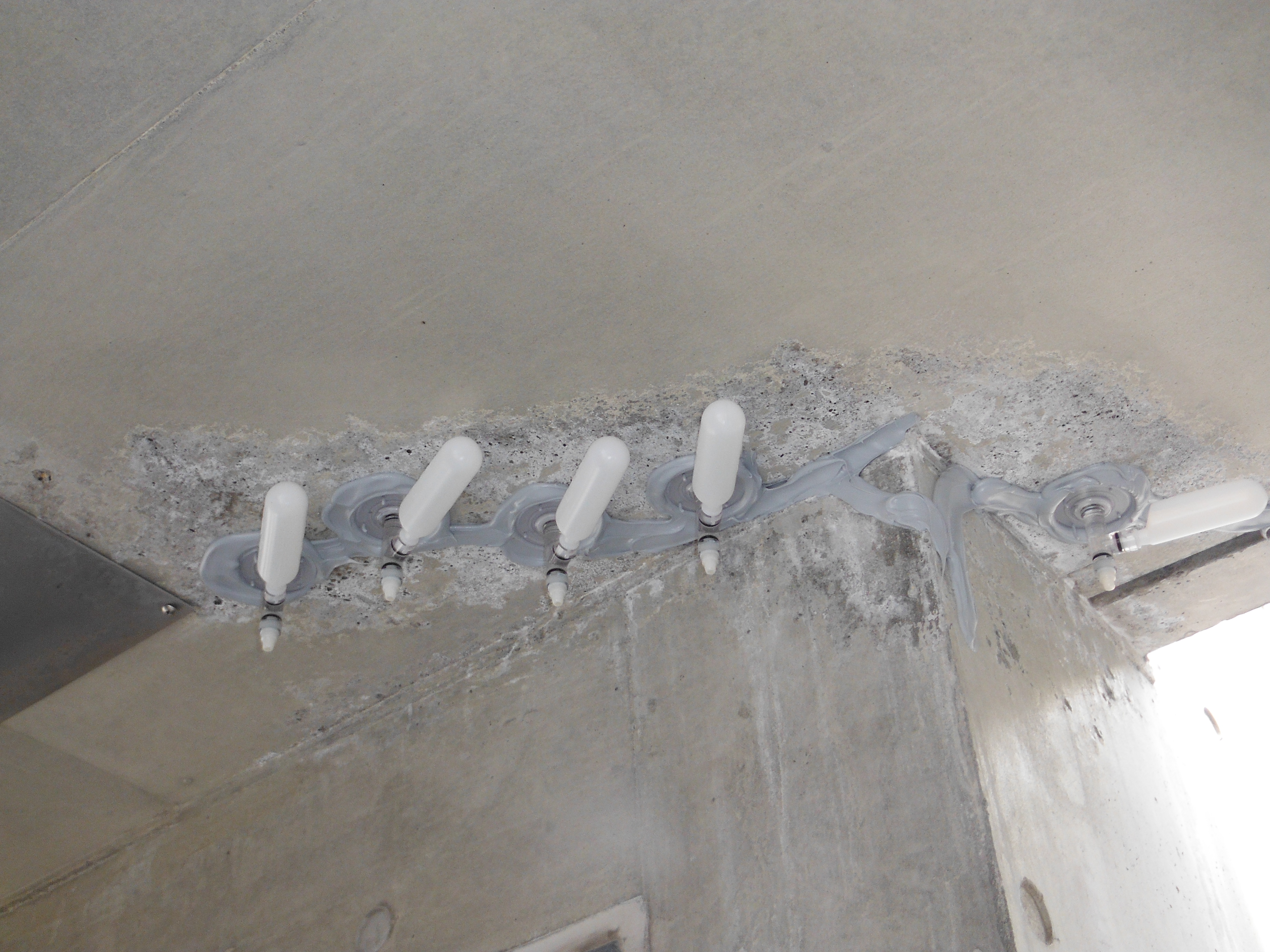 地下室での断熱材撤去後に高圧注入用ショットプラグ取り付け状況