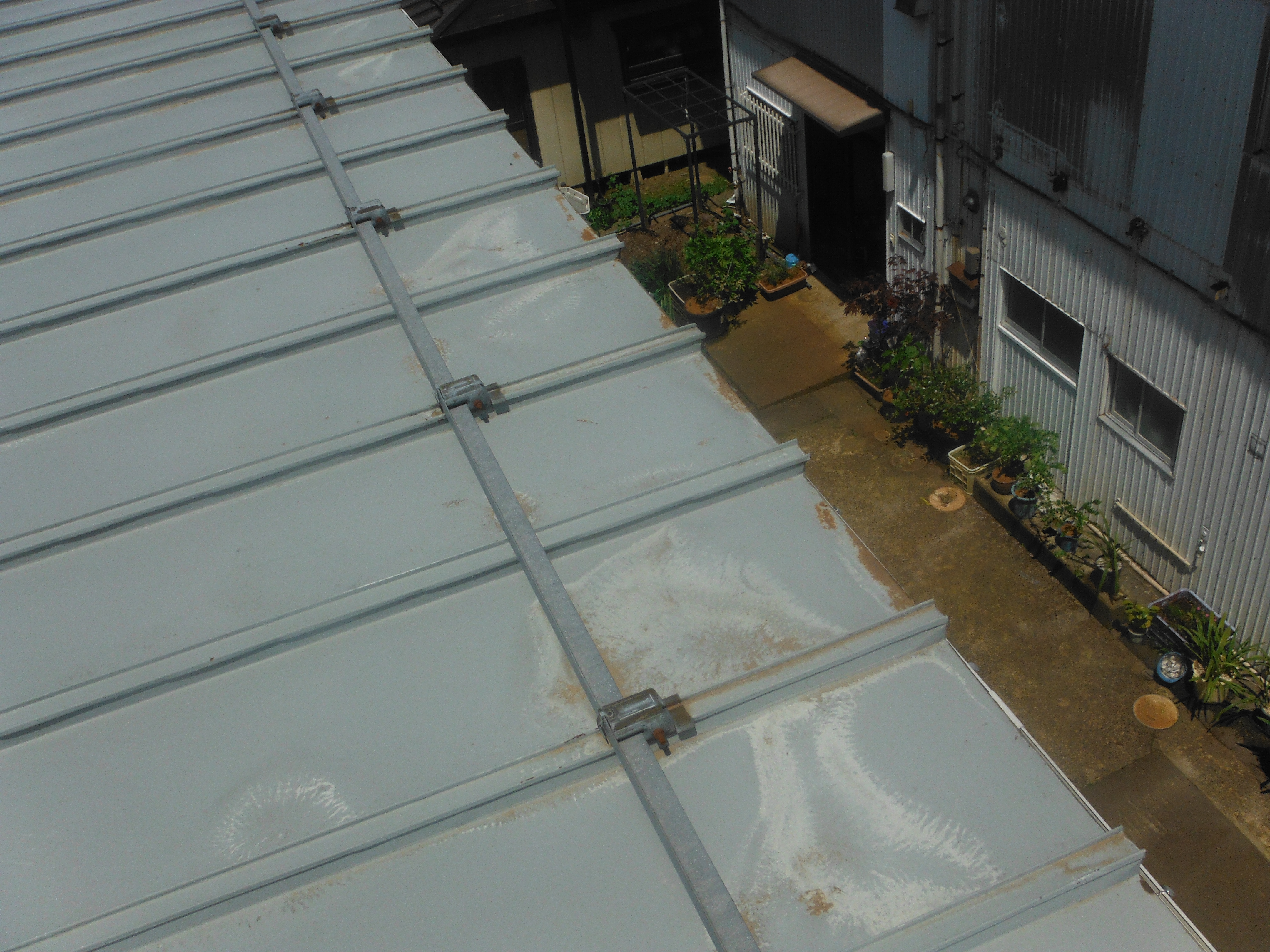 前回の当店で再塗装より14年経過した状況になります。まだ綺麗に見えますが塗膜にチョーキング現象が見られる為と鋼板が(亜鉛メッキ鋼板で有る為に修繕する事になりました。