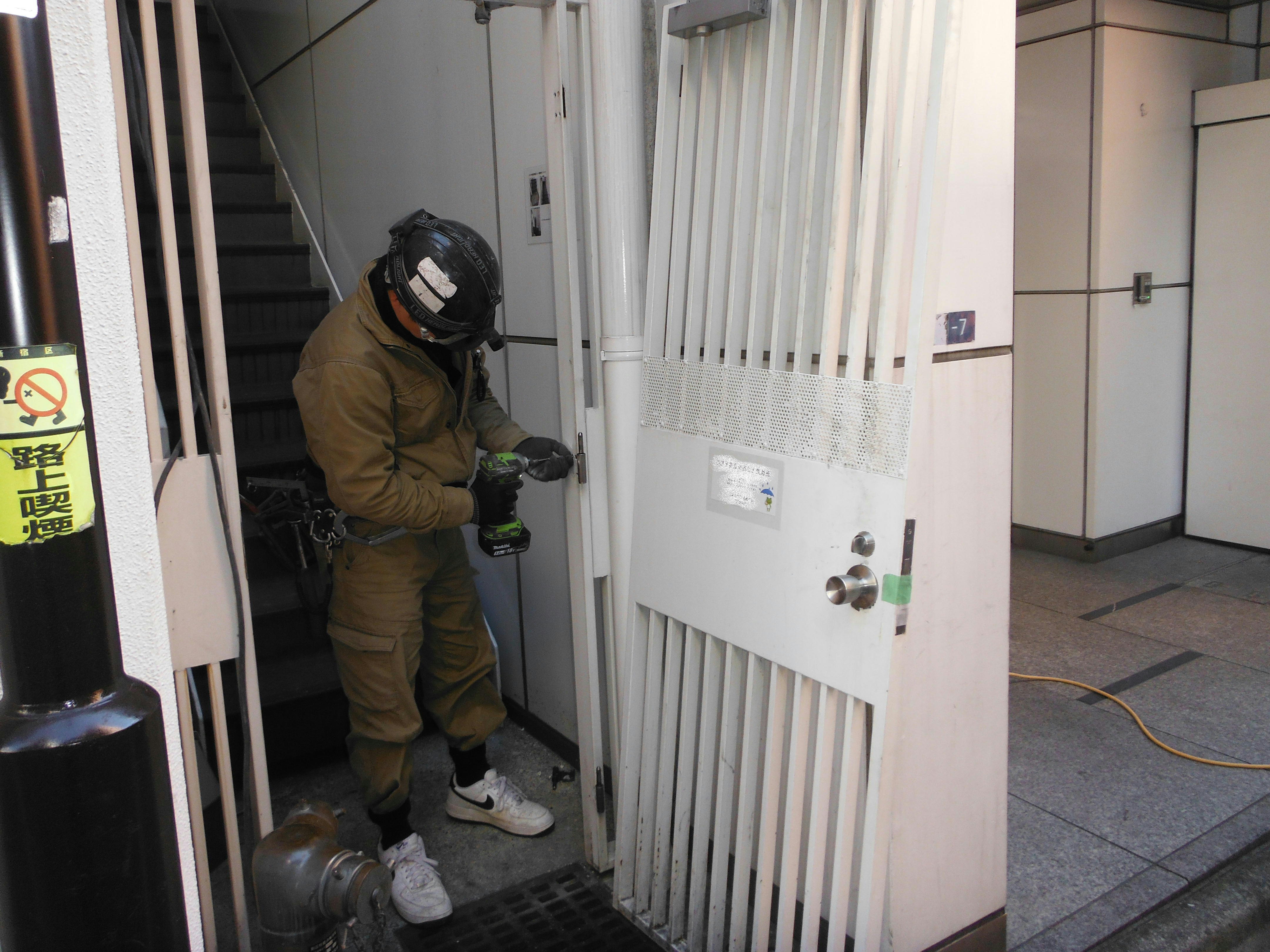 鋼製建具修繕工事 丁番加工 (重量のある疲労した鋼製建具を修繕します。)